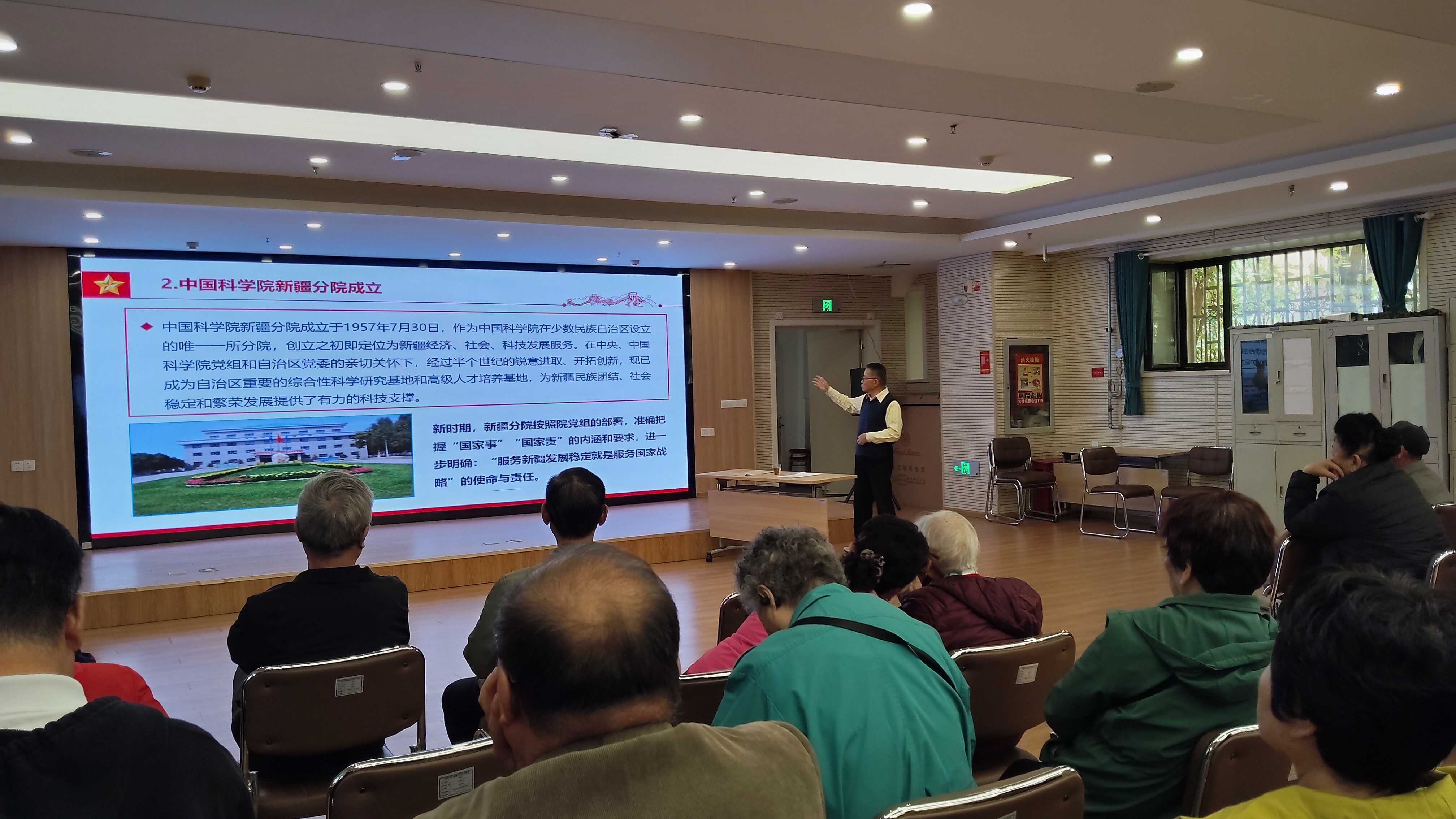 9月28日,中国科学院新疆分院老干部活动中心会议室里,五十多位银发老人目光炯炯,不时传出阵阵掌声,新疆分院分党组原书记牟振江以“立足国家战略,助力建设社会主义现代化新疆”为主题为退休干部们讲授一堂别开生面的专题党课。