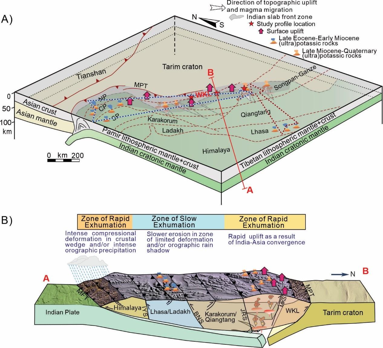 ????值得注意的是,自渐新世以来,冷却年龄与(超)钾质岩浆活动年龄呈现出从高原内部(羌塘—拉萨地块)向西昆仑逐渐变年轻的趋势。这一时空演变规律受控于印度板块持续向北楔入亚洲的深部动力过程。印度板片的俯冲、碰撞及其后期撕裂,共同调控了高原的“向外生长”与“岩浆迁移”。(科技日报记者 梁乐)
