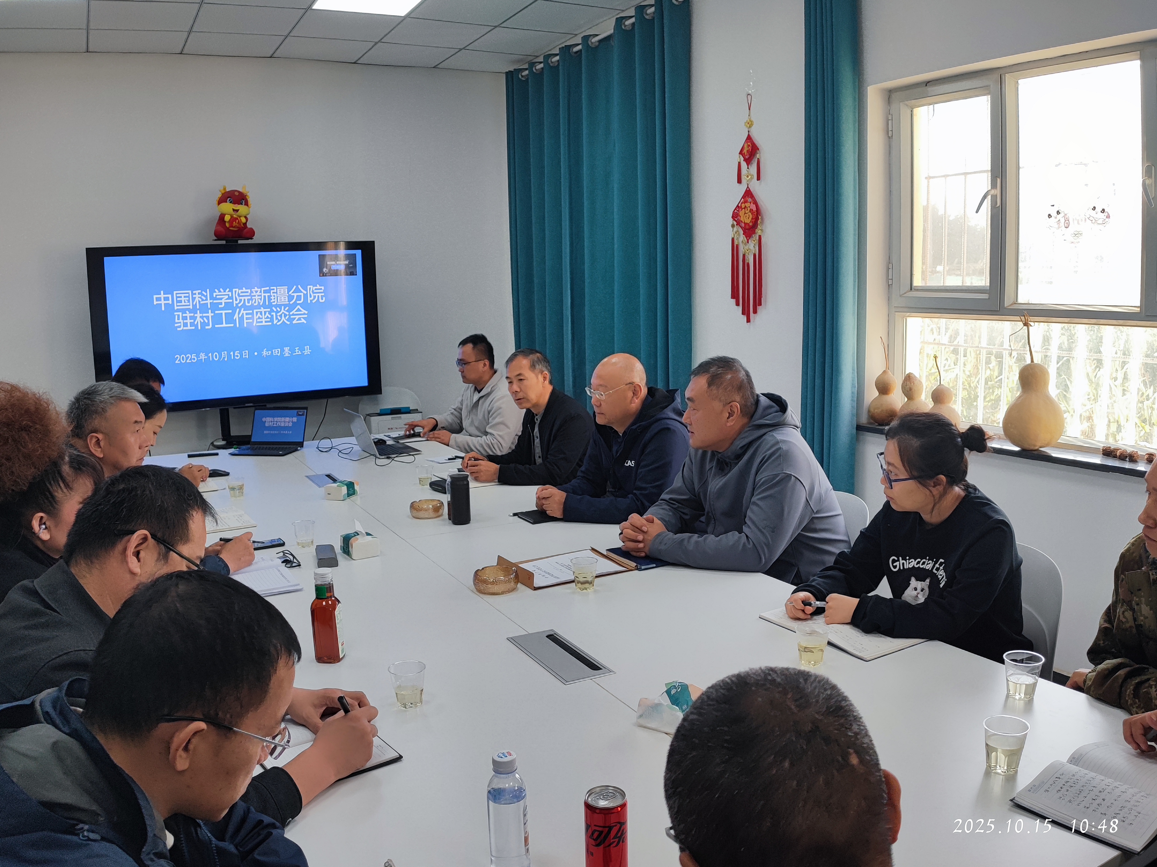 2025年10月15日,中国科学院新疆分院在墨玉县加汗巴格乡阿依玛克村召开驻村工作座谈会,新疆分院纪检组组长、分党组成员冯涛出席会议,分院系统驻村工作总领队、工作队第一书记、队长及全体队员参会,科技安全处处长王志明主持会议。